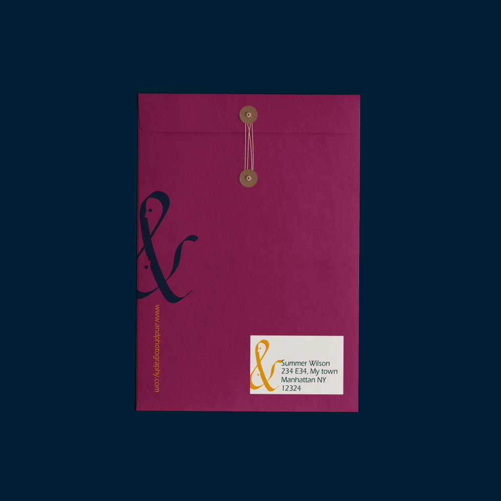 Diseño de identidad gráfica para una casa de fotografía de parejas, and photography, con un target diverso, sin tope de edad. Se enfocan en contraluces y efectos románticos, incluyendo paisajes para dar contexto a sus fotos. El logo está hecho a mano, con un solo trazo de dibujo para la letra &, que significa and o y.
