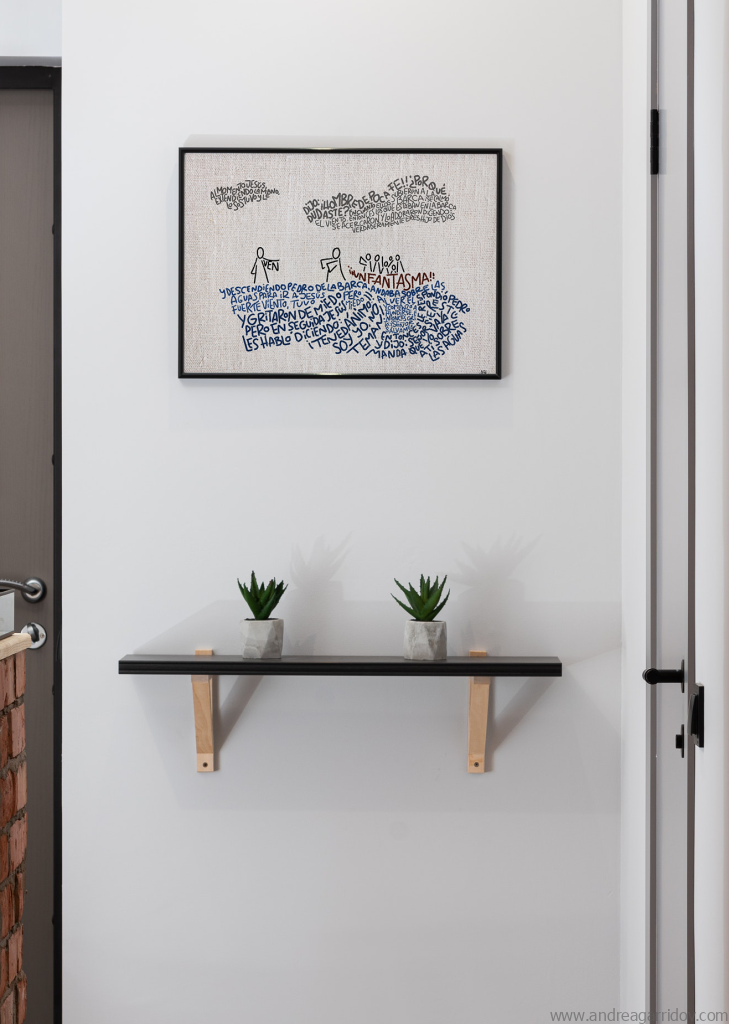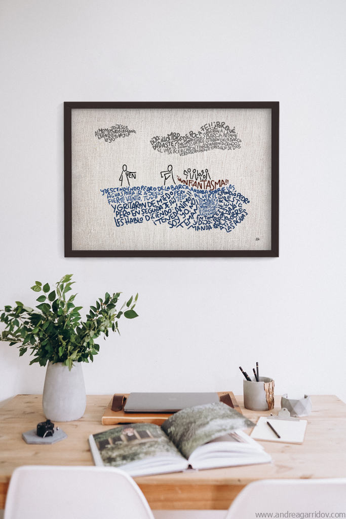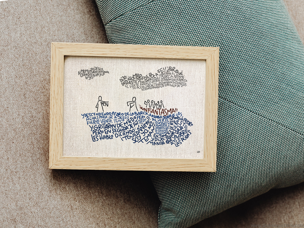 Este fue el primer arte que hice después de finalmente decidirme a hacerle caso a Dios, que hace tiempo me pide que utilice mis talentos para él. Después de mucha oración y discernimiento, he entendido que esta parte de mi trabajo tiene y quiere estar separada de todo lo demás que es del mundo. Espero que el Espíritu Santo pueda conquistar corazones y el objetivo es ofrecer piezas que ayuden a evangelizar de una manera sencilla, que estén en casa o en la oficina y alguien te pregunte ¿t eso qué dice?, o ¿qué quiere decir? e inicie una conversación sobre Jesús.